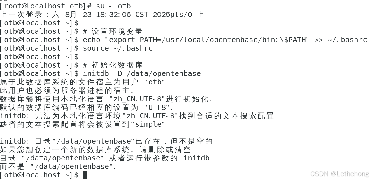 su - otb # 设置环境变量 echo "export PATH=/usr/local/opentenbase/bin:\$PATH" >> ~/.bashrc source ~/.bashrc # 初始化数据库 initdb -D /data/opentenbase