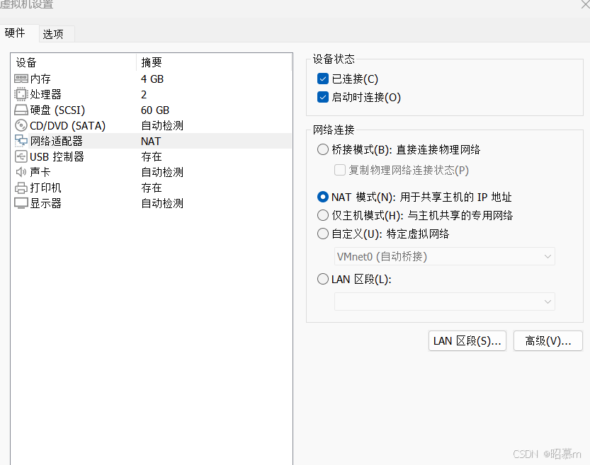 VMware:虚拟机设置 → 网络适配器 → 选择 NAT 或 桥接模式。
