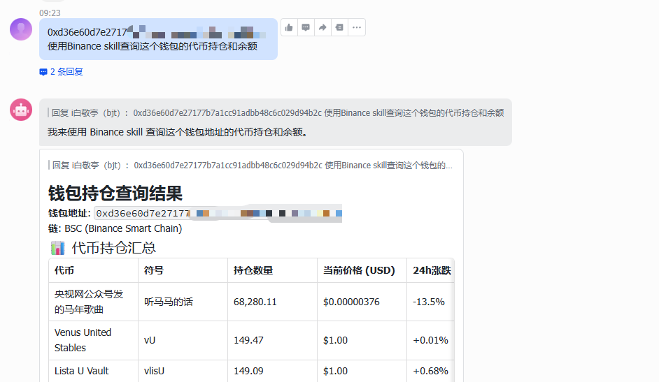 理论讲完了,让我们通过几个实测场景,感受一下OpenClaw+币安技能包的强大威力。