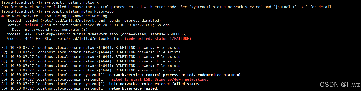 ● network.service - LSB: Bring up/down networking Loaded: loaded (/etc/rc.d/init.d/network; bad; vendor preset: disabled) Active: failed (Result: exit-code) since 六 2024-08-10 00:07:27 CST; 6s ago Docs: man:systemd-sysv-generator(8) Process: 4171ExecStop=/etc/rc.d/init.d/network stop (code=exited, status=0/SUCCESS) Process: 4644ExecStart=/etc/rc.d/init.d/network start (code=exited, status=1/FAILURE) 8月 10 00:07:27 localhost.localdomain network[4644]: RTNETLINK answers: File exists 8月 10 00:07:27 localhost.localdomain network[4644]: RTNETLINK answers: File exists 8月 10 00:07:27 localhost.localdomain network[4644]: RTNETLINK answers: File exists 8月 10 00:07:27 localhost.localdomain network[4644]: RTNETLINK answers: File exists 8月 10 00:07:27 localhost.localdomain network[4644]: RTNETLINK answers: File exists 8月 10 00:07:27 localhost.localdomain network[4644]: RTNETLINK answers: File exists 8月 10 00:07:27 localhost.localdomain systemd[1]: network.service: control process exited, code=exited status=18月 10 00:07:27 localhost.localdomain systemd[1]: Failed to start LSB: Bring up/down networking. 8月 10 00:07:27 localhost.localdomain systemd[1]: Unit network.service entered failed state. 8月 10 00:07:27 localhost.localdomain systemd[1]: network.service failed.