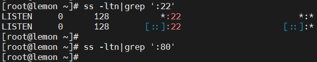 ss -ltn |grep':22' ss -ltn |grep':80'