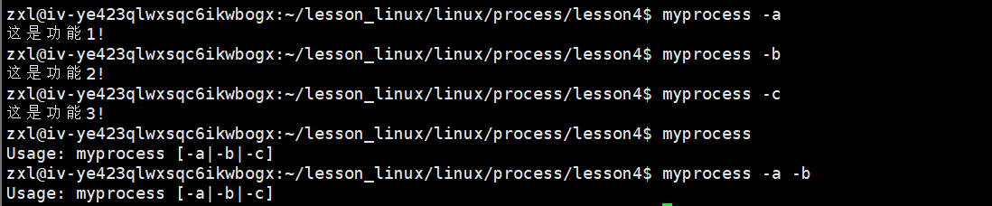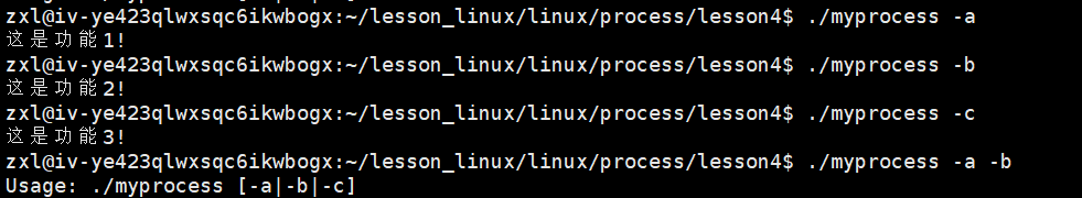 #include<stdio.h> #include<string.h> int main(int argc, char* argv[]) { if (argc != 2) { printf("Usage: %s [-a|-b|-c]\n", argv[0]); return 0; //代码在执行时一定要带-a|-b|-c选项; } const char* arg = argv[1]; if(strcmp(arg, "-a") == 0) printf("这是功能1!\n"); else if(strcmp(arg, "-b") == 0) printf("这是功能2!\n"); else if(strcmp(arg, "-c") == 0) printf("这是功能3!\n"); else printf("Usage: %s [-a|-b|-c]\n", argv[0]); return 0; }