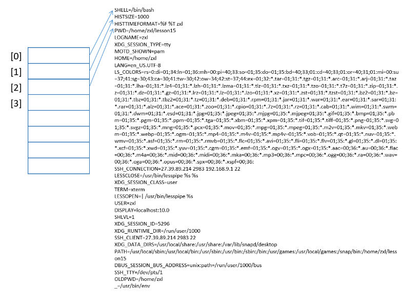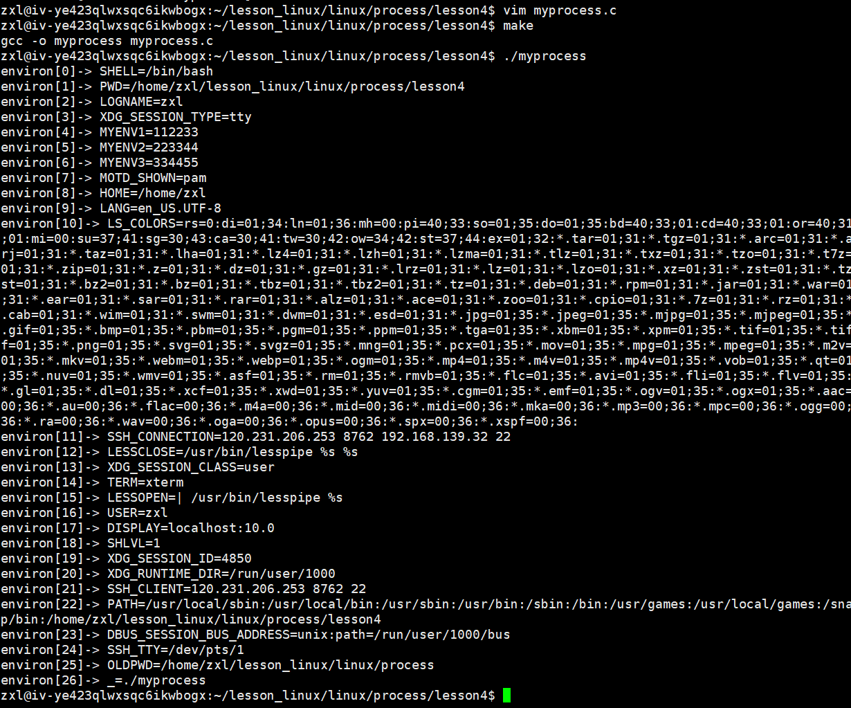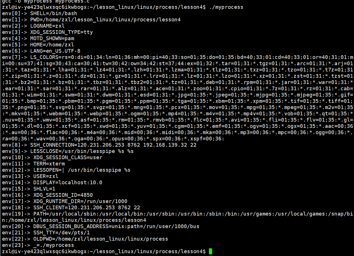 #include<stdio.h> #include<unistd.h> extern char** environ; //要使用这个函数得先定义 int main(int argc, char* argv[]) { (void) argc; (void) argv; //防止系统报错 for(int i = 0; environ[i]; i++) { printf("environ[%d]-> %s\n", i, environ[i]); } return 0; }