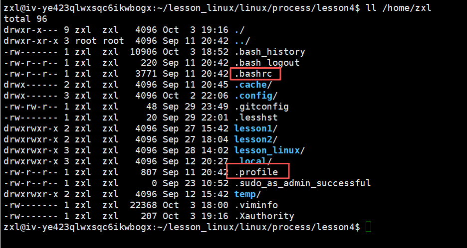 我们的环境变量最开始是从我们的配置文件中来的,我们 Linux 系统存在着相关的配置文件,这些文件包含了我们所有的环境变量的直接或间接的内容。我们的 bash 在启动时就会从我们的配置文件中读取我们所有的环境变量的值并创建环境变量表。我们可以看到我们系统在家目录中有两个隐藏文件。