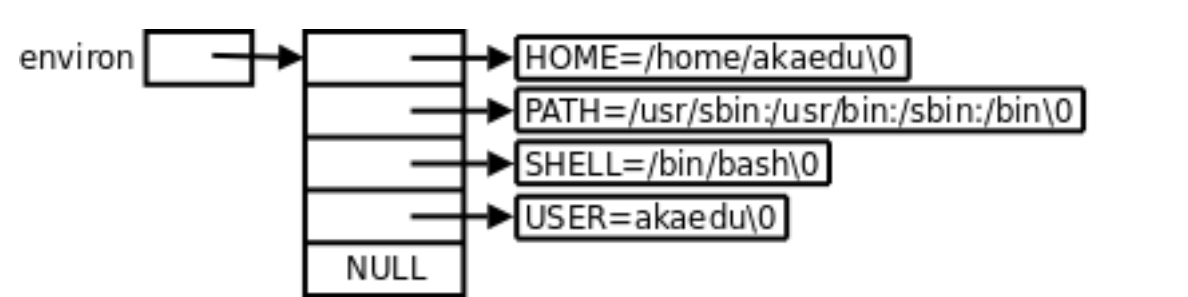 每个程序都会收到一张环境表,环境表是一个字符指针数组,每个指针指向一个以 ’\0’ 结尾的环境字符串。