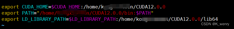 export CUDA_HOME=$CUDA_HOME:/home/XXX/CUDA12.0.0 export PATH="/home/XXX/CUDA12.0.0/bin:$PATH" export LD_LIBRARY_PATH=$LD_LIBRARY_PATH:/home/XXX/CUDA12.0.0/lib64