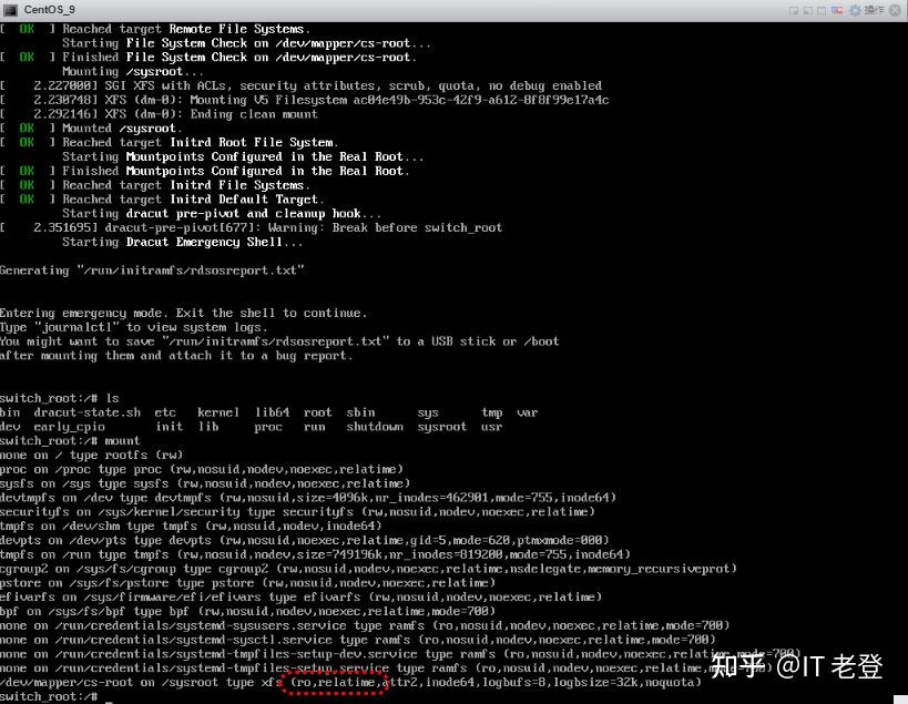 知识点补充:/sysroot 是dracut(initramfs生成工具)默认使用的硬盘根文件系统挂载点。不同发行版可能略有差异,但CentOS/RHEL/Fedora系列均遵循此规则。