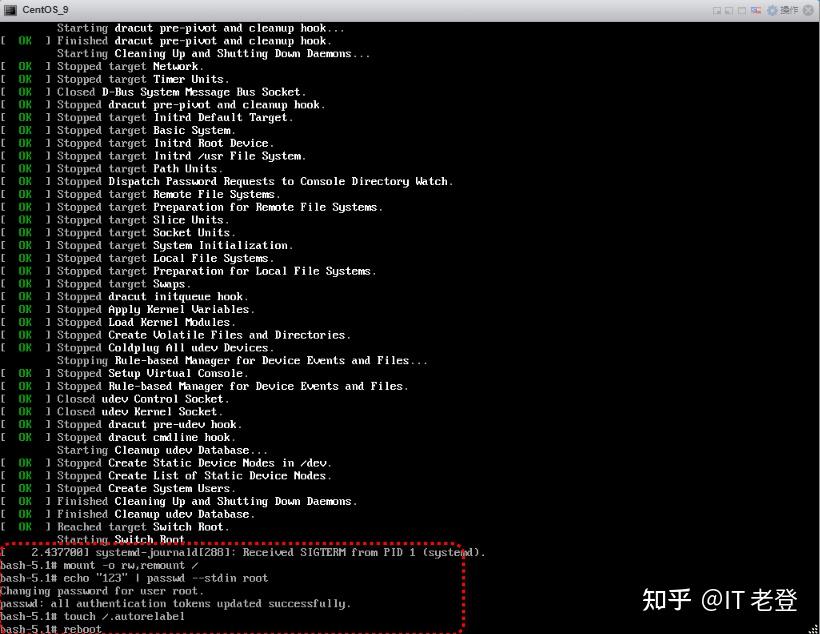 mount -o rw,remount / # 重新挂载文件系统,并将其设置为可写 echo "123" | passwd --stdin root # 为root用户更改密码为123 touch /.autorelabel # 对于开启selinux的可能需要执行touch /.autorelabel命令,这个是触发系统在下次启动时重新标记selinux安全上下文的命令。这个不执行可能会导致密码修改/重置失效,或在重启系统的时候提示密码错误。 reboot # 重新启动