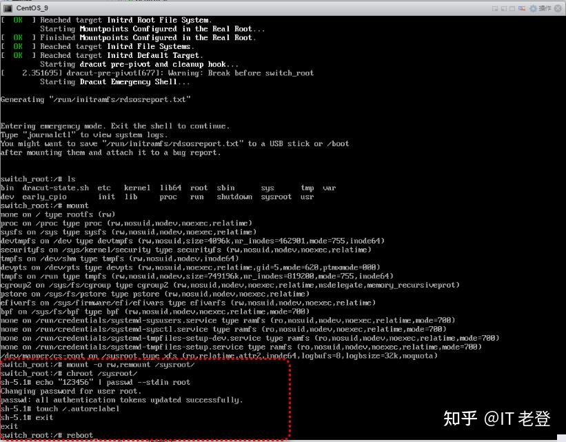 mount -o rw,remount /sysroot/ # 重新挂载文件系统,并将其设置为可写 chroot /sysroot/ # 切换系统根目录 echo "123456" | passwd --stdin root # 为root用户更改密码为123456 touch /.autorelabel # 对于开启selinux的可能需要执行touch /.autorelabel命令,这个是触发系统在下次启动时重新标记selinux安全上下文的命令。这个不执行可能会导致密码修改/重置失效,或在重启系统的时候提示密码错误。 exit reboot # 重新启动