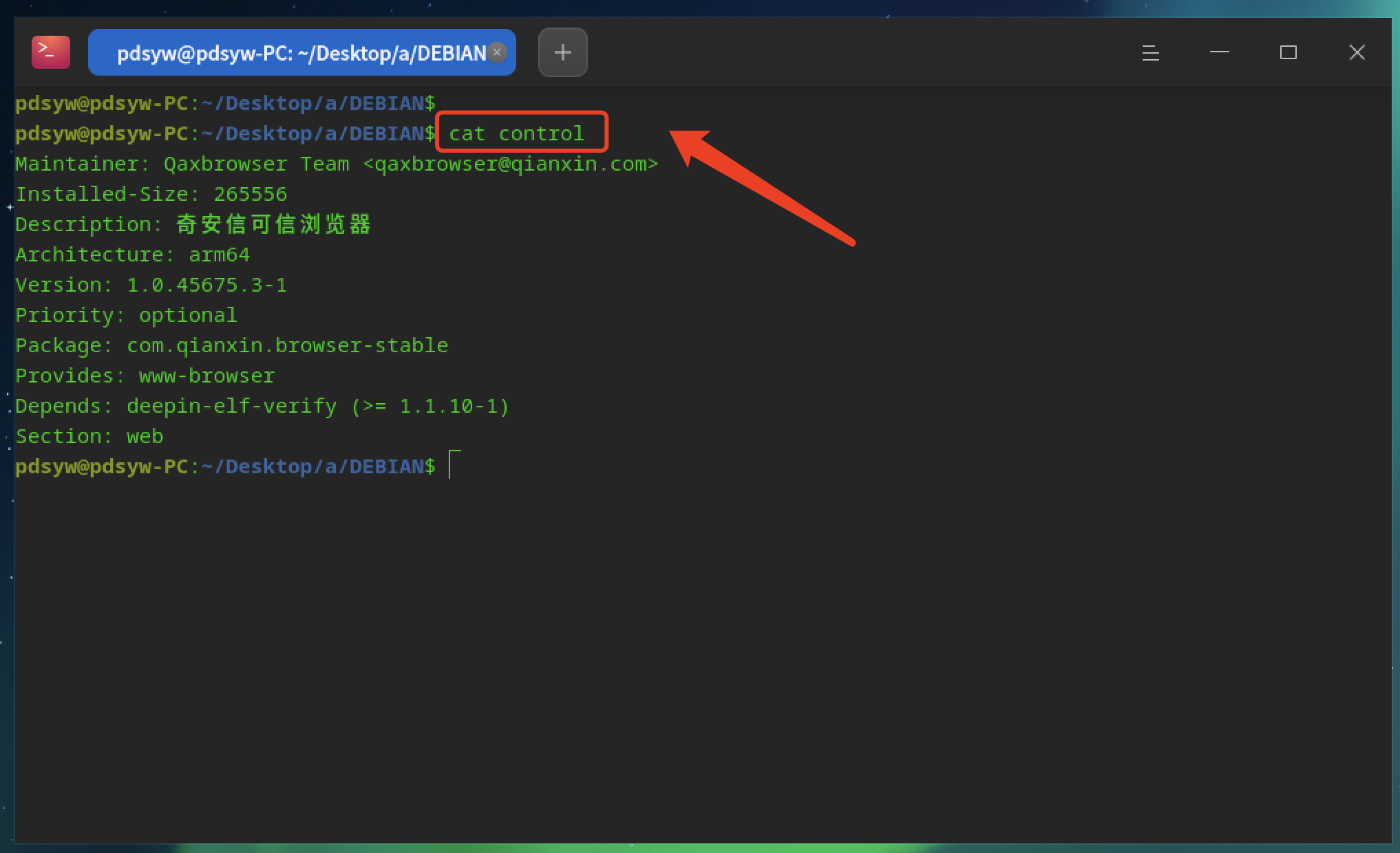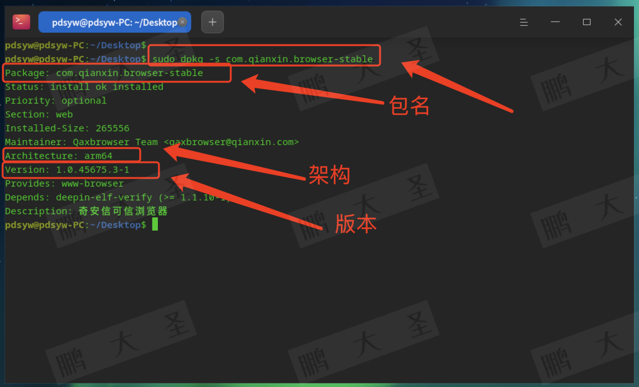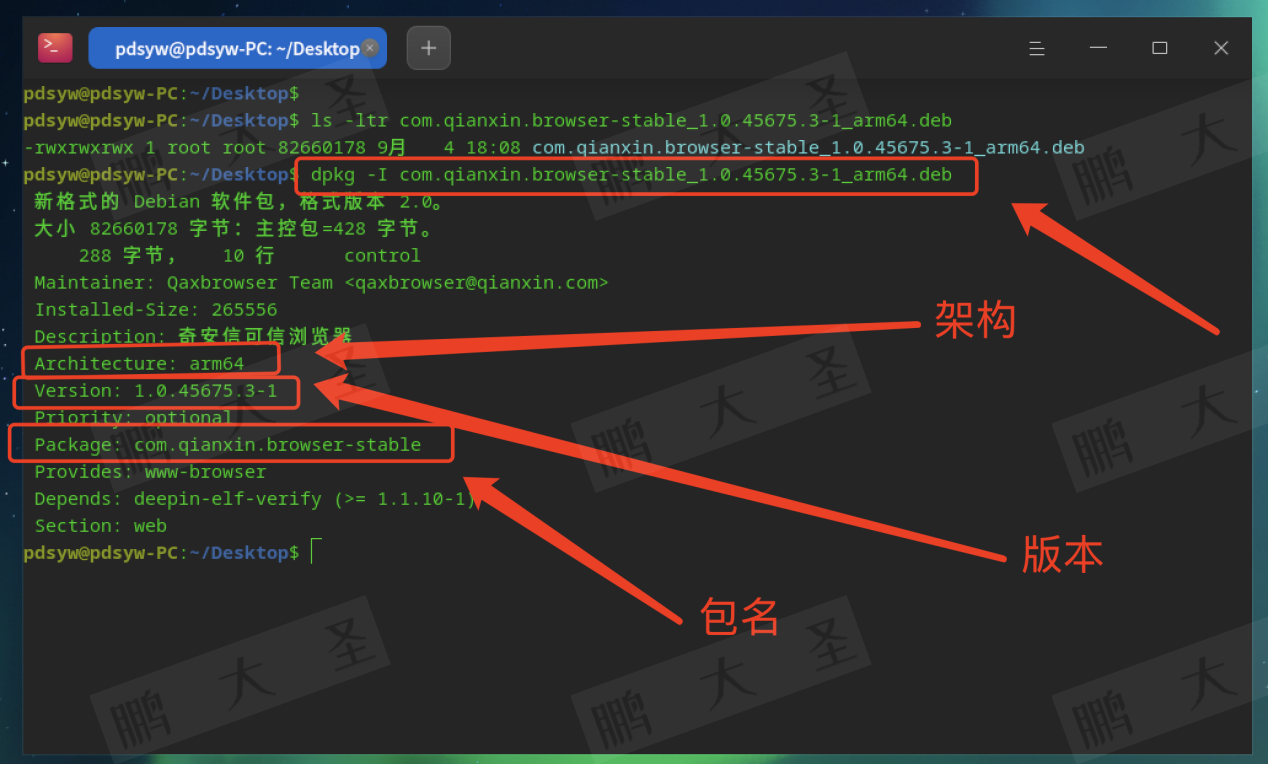 pdsyw@pdsyw-PC:~/Desktop$ ls -ltr com.qianxin.browser-stable_1.0.45675.3-1_arm64.deb pdsyw@pdsyw-PC:~/Desktop$ dpkg -I com.qianxin.browser-stable_1.0.45675.3-1_arm64.deb