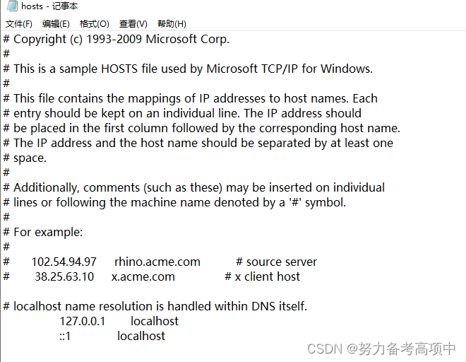 注意:每个映射关系应该占据一行,IP地址和域名之间使用制表符或空格进行分隔。