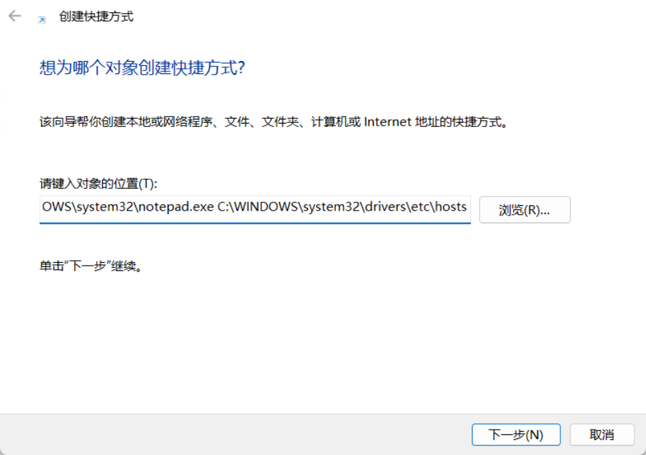 2. 位置填写为:C:\WINDOWS\system32\notepad.exe C:\WINDOWS\system32\drivers\etc\hosts