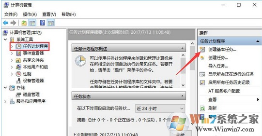 2、这时会打开任务计划程序,右边有一个创建基本任务和一个创建任务,我们先点开创建基本任务。