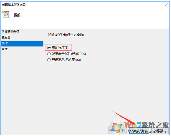 5、选择一个操作,小编选择启动程序,然后选择一个批处理,因为我们的批处理不用传参,可选参数就不管了,直接下一步。