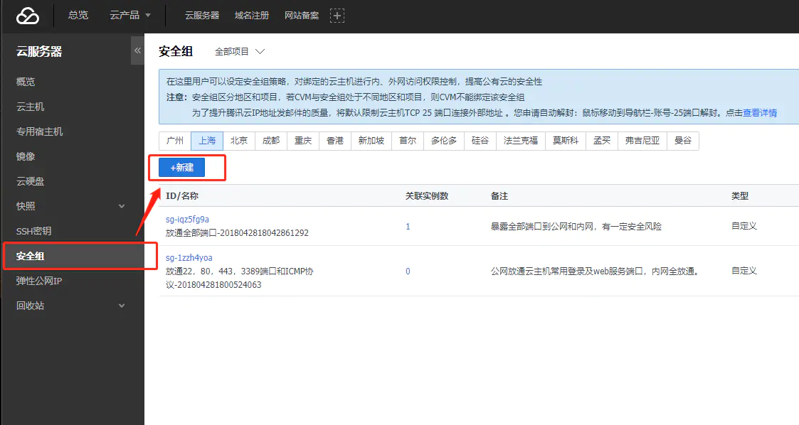安全组的意思就是,我要允许/拒绝哪些ip和端口能够访问我的服务器,具体操作很简单,如下: