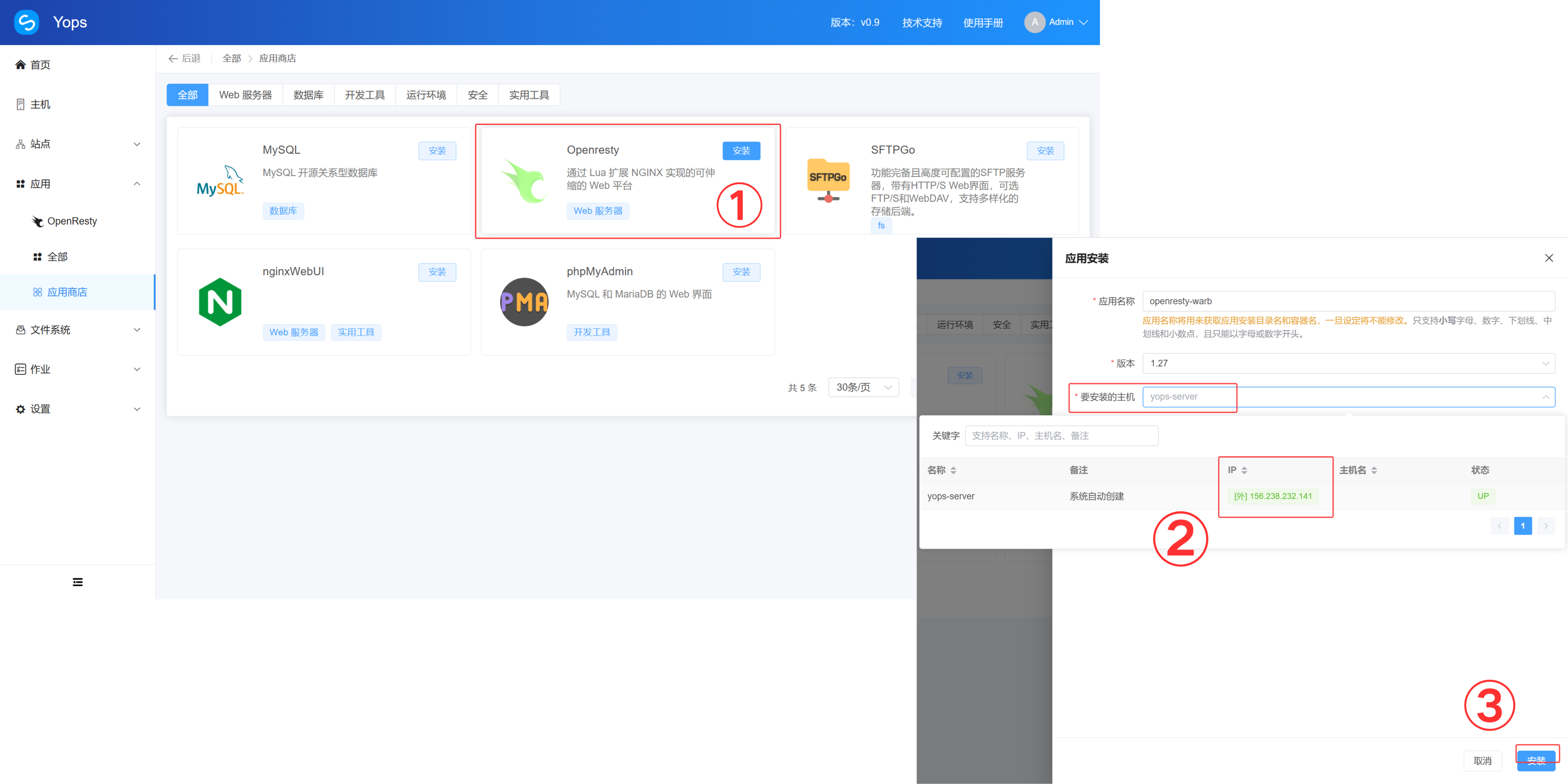 如果你是首次安装Yops运维面板,打开Yops运维面板应用商店需要给服务器安装Openresty应用