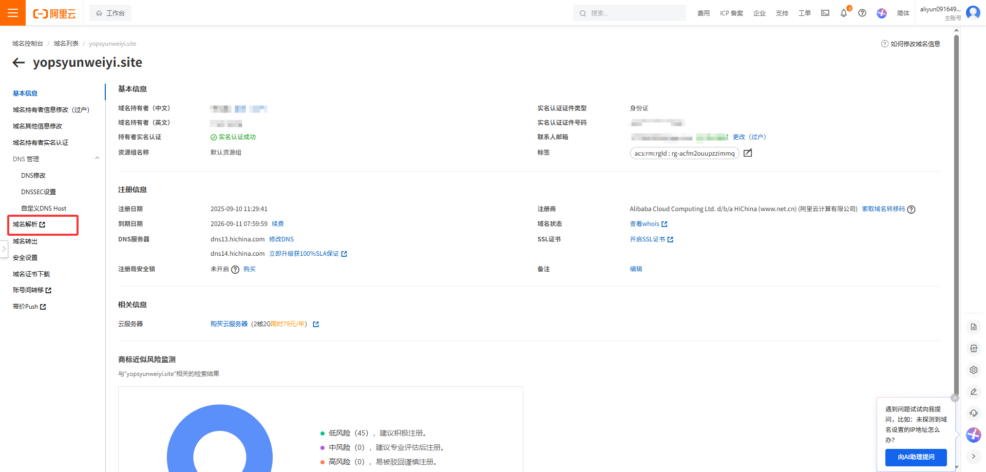 以我在阿里云购买的域名为例,首先打开阿里云的域名控制台