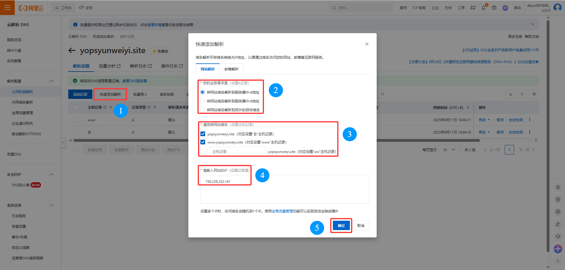 选择公网权威解析,快速添加解析,域名解析业务需求有三种,根据实际的公网ip格式进行选择即可,域名都勾选上,主机记录可根据实际进行配置,输入实际的云服务器公网IP并确定就完成域名解析了