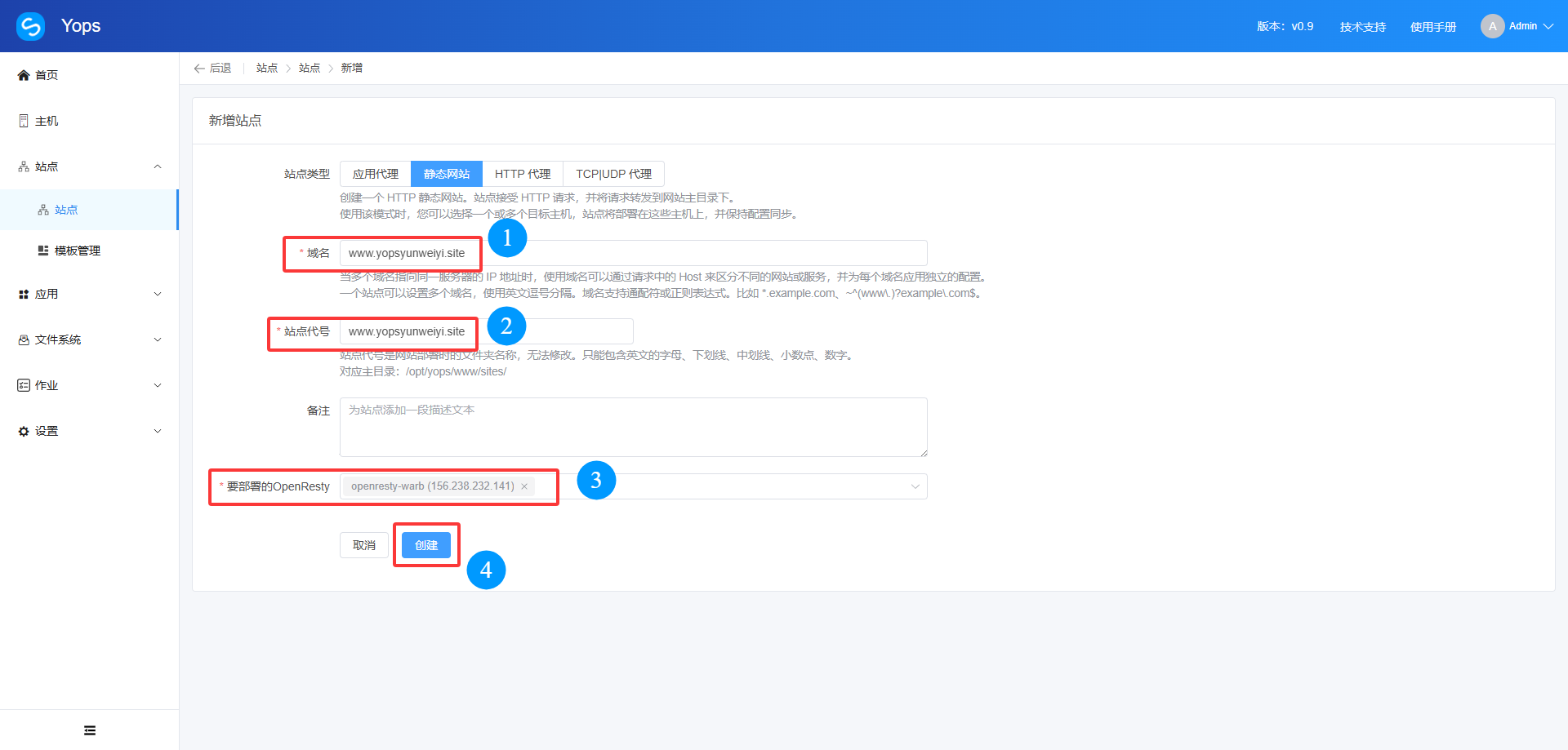 进入 Yops 运维面板打开站点模块,选择 "新增"。